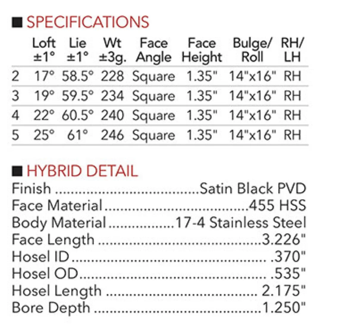 2 hybrid (17°), 3 hybrid (19°), 4 hybrid (22°), and 5 hybrid (25°) heads offered to replace fairway woods and long irons
