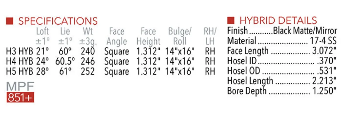 3 hybrid (21°), 4 hybrid (24°), and 5 hybrid (28°) heads offered to replace fairway woods and long irons
